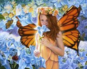 L\'enfance montre le puzzle Innocence , où vous couchez l\'image d\'une jeune fille avec des ailes de papillon bleu azur. Ses longs cheveux décoré avec couronne de fleurs. l\'image remplie de fleurs...